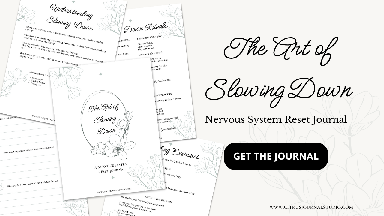 The Art of Slowing Down is a gentle journal designed to help you move out of survival mode and into safety, presence, and spaciousness.