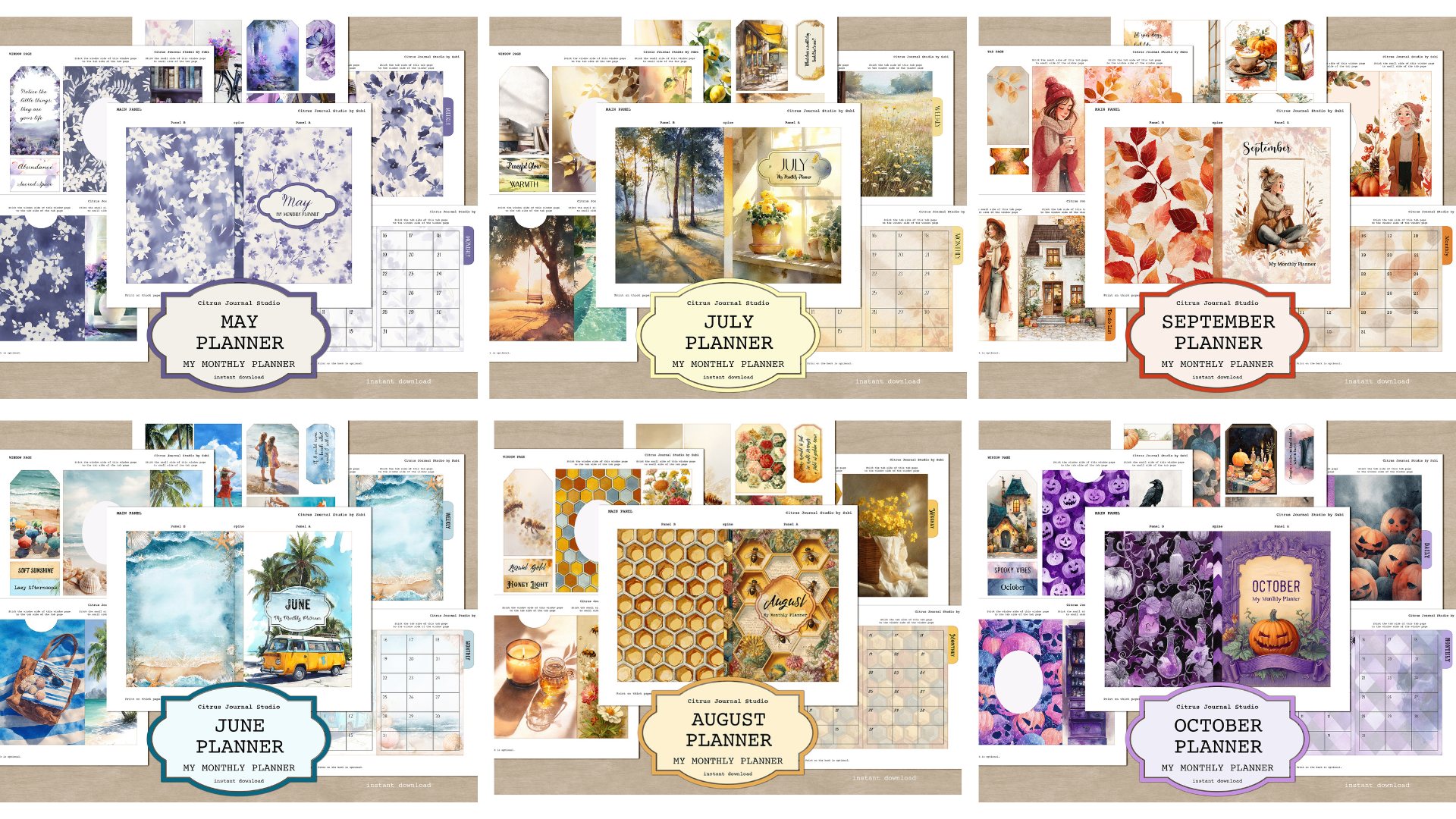 Each monthly planner includes 14 beautifully designed pages, featuring monthly, weekly, and daily layouts, along with gentle journaling prompts and seasonal creative elements.